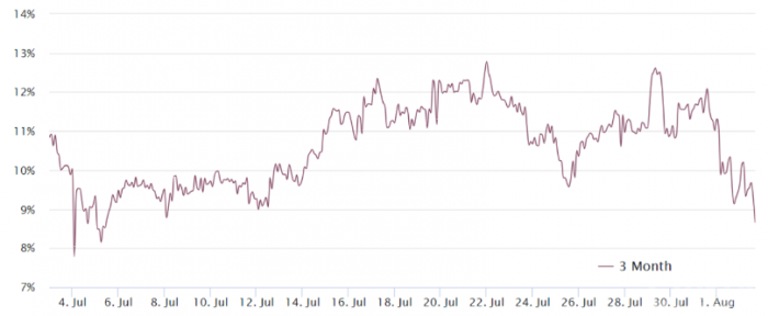 在7月23日現(xiàn)貨ETF推出之前,Ethereum月度期貨曾表現(xiàn)出溫和的樂觀情緒,溢價達到12%。現(xiàn)貨ETF的凈流出和更廣泛的crypto市場調(diào)整導致該指數(shù)在8月2日下跌至8%。考慮到價格在24小時內(nèi)下跌10%,這一水平雖屬中性,但并不罕見。
