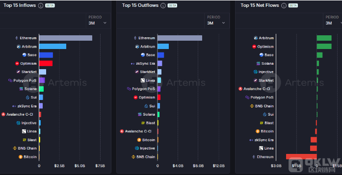 在L2鏈中,樂觀(Optimism,簡稱OP)成為了最重要的凈流入接收者,主要流動性來源于Ethereum。相比之下,Arbitrum(ARB)雖然整體活動較高,但資產(chǎn)保留量相對較低。不過,這兩條L2鏈都吸引了超過10億美元的流動性,顯示出強(qiáng)勁的市場需求。