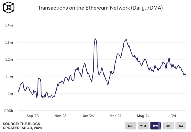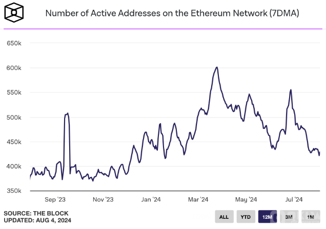 不僅是新地址數量,最近Ethereum網絡的平均活躍地址和交易數量也有所下降,達到了近六個月來的最低水平。這一趨勢進一步表明,市場參與者的行為正在發生變化,可能轉向更便捷的ETF投資渠道。