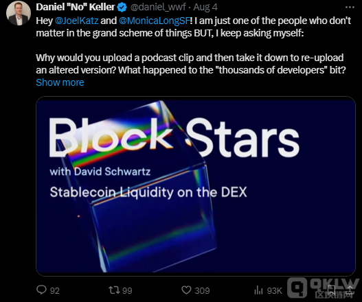Eminence首席技術(shù)官兼XRPL大使Daniel “No” Keller是第一個(gè)公開表達(dá)失望的人之一。Keller在推文中質(zhì)問Schwartz和Long:“為什么你們上傳了播客的標(biāo)準(zhǔn)版本,然后將其刪除并重新上傳編輯后的版本?‘?dāng)?shù)千名開發(fā)者’部分到底發(fā)生了什么?Ripple和RippleX讓社區(qū)感到失望。為什么要假裝一切都很好呢?”
