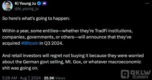 Ki Young Ju還預測,未來一年內,包括傳統金融機構、企業和政府部門在內的部分組織可能會在其2024年第三季度的資產負債表中披露其Bitcoin持倉情況。他補充道:“散戶投資者可能會因為擔憂德國政府拋售、Mt. Gox事件或其他宏觀經濟問題而后悔未能及時買入。”
