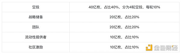 根據(jù)Whitepaper顯示:JUP 總量為 100 億枚,現(xiàn)在流通量為 13.5 億枚,流通率為 13.5% 。初始流通量為 13.5 億枚,其中 10 億枚用于空投, 2.5 億枚用于Launchpool,另外還有 5000 萬枚分別用于CEX做市和鏈上LP需求??傮w的Tokens分配如下: