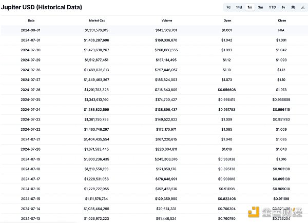 FDV:JUP 現(xiàn)幣價為 0.973 美元,總流通量為 100 億枚,市值為: 97.3 億美元。日均交易量