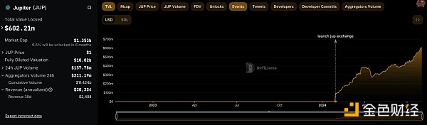 可以看出近半年以來 Jupiter 的 TVL 一直在增長,現(xiàn)已經(jīng)達(dá)到了 6.02 億美元。日交易量