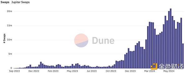 Jupiter 成立于 2021 年,他的項(xiàng)目定位是 Solana Blockchain上的Decentralization交易流動性聚合器,經(jīng)過 3 年的發(fā)展,現(xiàn)在 Jupiter 已經(jīng)匯集了 Solana 鏈上超過一半以上的交易量,可以說已經(jīng)發(fā)展到了 Solana 鏈上交易聚合器的天花板級別了,在其項(xiàng)目主項(xiàng)的交易聚合器上已經(jīng)沒有太多的發(fā)展空間了,從而其開始了橫向開發(fā)業(yè)務(wù)的項(xiàng)目發(fā)展方向,分別推出了Launchpad 平臺 JupiterStart 和孵化器 JupiterLabs,通過孵化其他一些高質(zhì)量的項(xiàng)目來達(dá)到 Jupiter 在各個平行領(lǐng)域中橫向發(fā)展的目的。項(xiàng)目基本信息基礎(chǔ)信息