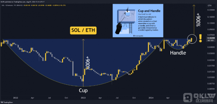 自6月23日以來,SOL/ETH交易對在日線圖上形成了連續的高點,顯示出上漲的強烈趨勢。知名交易員Duo Nine曾在5月7日的社交媒體上表示,基于杯柄形態的技術分析,Solana 可能即將迎來突破。