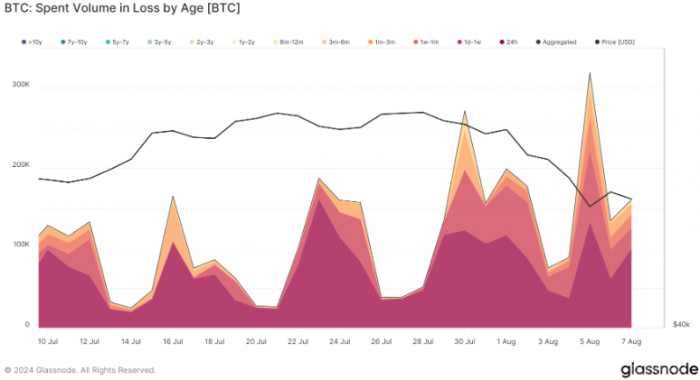 近期Bitcoin市場經歷了劇烈的價格波動,導致虧損交易量達到自FTX崩潰以來的最高水平。根據最新數據顯示,從8月3日至5日,Bitcoin價格從60,000美元急劇下跌至54,000美元,這一波動引發(fā)了大規(guī)模的虧損交易。8月3日的總虧損交易量超過74,890BTC,而到8月5日,這一數字飆升至319,290BTC,創(chuàng)下了自2022年11月28日以來的最高水平。