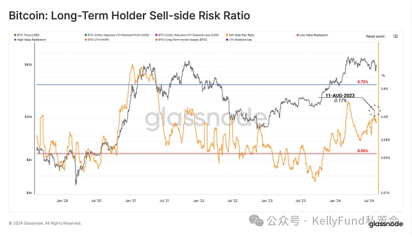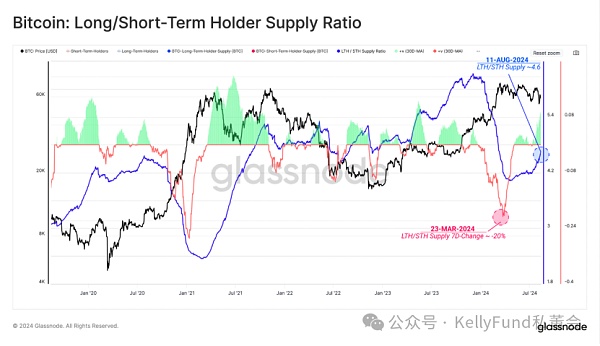 與過去周期中,Bitcoin價格突破歷史峰值之后的情況相比,目前在全網(wǎng)資產(chǎn)中,由長期持有者持有的比例相對較大。