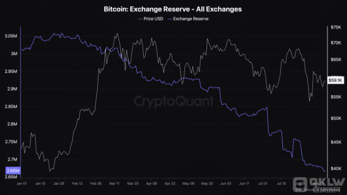 盡管價(jià)格在短期內(nèi)保持穩(wěn)定,Bitcoin的需求卻在不斷增加。CryptoQuant的數(shù)據(jù)顯示,到2024年,Bitcoin的交易儲(chǔ)備將顯著減少,表明市場(chǎng)正在經(jīng)歷供應(yīng)緊張。當(dāng)需求上升而供應(yīng)減少時(shí),通常會(huì)推高價(jià)格。
