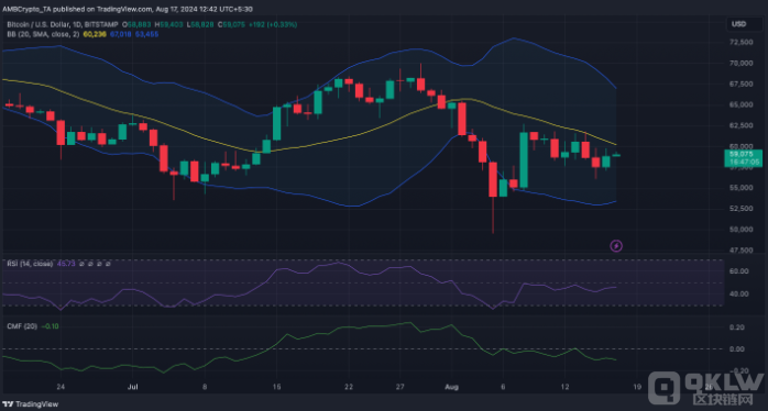 從技術(shù)分析的角度來(lái)看,Bitcoin的布林線顯示出其即將測(cè)試20日簡(jiǎn)單移動(dòng)平均線(SMA)的阻力位。此外,相對(duì)強(qiáng)弱指數(shù)(RSI)的上升表明,Bitcoin可能會(huì)突破20日移動(dòng)平均線。柴金資金流向(CMF)指標(biāo)的下滑則顯示出一定的看跌情緒。