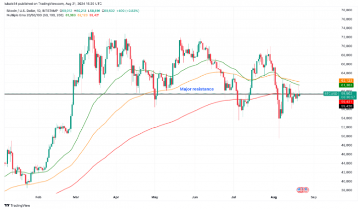 根據(jù)TradingView的數(shù)據(jù),Bitcoin的價(jià)格在日線圖上形成了一系列更高的低點(diǎn),但在過去7天內(nèi)仍低于200日指數(shù)移動(dòng)平均線 (EMA)。數(shù)據(jù)顯示,200日均線位于59,423美元附近,成為強(qiáng)勁阻力。