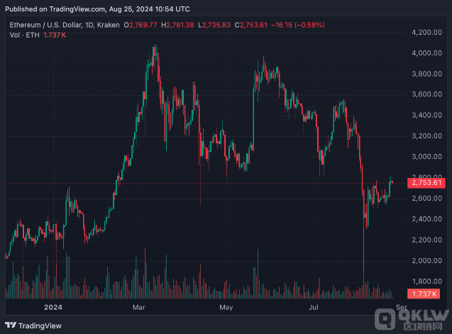 目前,ETH價格交易于2,753美元,當日下跌0.6%。第二大crypto目前處于2,500美元至2,800美元之間的狹窄區間。如果ETH多頭能夠重新控制市場,山寨幣可能會突破盤整區間,下一個主要阻力位為3,560美元。然而,相反的情況可能會導致巨大的拋售壓力,使Ethereum價格跌至2,100美元。