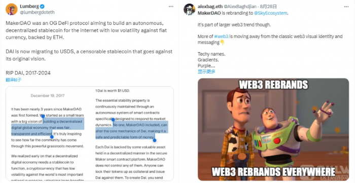 上周,MakerDAO 宣布將其品牌名稱正式更改為 Sky Protocol,并將原有的Tokens和穩(wěn)定幣升級為 SKY 和 Sky Dollar(USDS)。這一舉動迅速引發(fā)了社區(qū)的廣泛討論,尤其是在老用戶中間引起了不少質(zhì)疑和批評。批評者認為,新的名字缺乏特色,更像是一家 Web2 公司,與 Web3 的Decentralization精神背道而馳。此外,關(guān)于原X(推特)賬戶的管理不善也進一步加劇了社區(qū)的不滿。盡管如此,這一改名行動仍然成為行業(yè)內(nèi)的焦點,尤其是在當今市場環(huán)境下,許多項目都在采用類似的策略,試圖通過品牌重塑來重新吸引市場的關(guān)注。