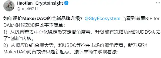 以 MakerDAO 為例,其更名為 Sky Protocol 的決定背后有著深刻的戰(zhàn)略考量。加密研究員 Haotian 指出,對于像 MakerDAO 這樣的老牌 DeFi 項目,監(jiān)管合規(guī)問題是繞不開的挑戰(zhàn)。尤其是在市場擴展的過程中,迎合監(jiān)管要求幾乎是不可避免的。而此次更名,可能是 MakerDAO 為適應(yīng)監(jiān)管環(huán)境、拓展市場所作出的第一步。