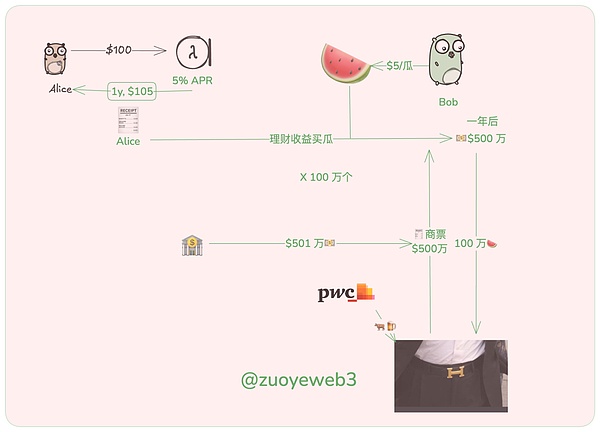 2.Bob是開西瓜攤的,為了賣更多的瓜,他現在允許Alice拿著理財證明來這吃$5的瓜,一年后Bob憑票兌換理財產品的5美元。