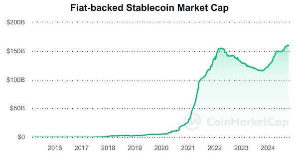 穩(wěn)定幣的市值在一定程度上反映增量資金的進(jìn)入情況。在加密市場(chǎng)中,當(dāng)用戶用法幣購(gòu)買穩(wěn)定幣時(shí),這些資金就會(huì)流入市場(chǎng),推動(dòng)穩(wěn)定幣的市值上升。觀察穩(wěn)定幣的市值變化可以幫助判斷市場(chǎng)中的資金流動(dòng)情況。