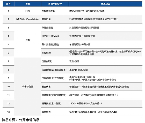 游戲數(shù)值規(guī)劃是一個(gè)動(dòng)態(tài)的過程,需要根據(jù)玩家定位和喜好、實(shí)際運(yùn)營(yíng)情況以及玩家反饋等數(shù)據(jù)不斷調(diào)整。在MOBA游戲中,這可能涉及地圖大小、角色移動(dòng)速度、各種屬性、職業(yè)成長(zhǎng)趨勢(shì)、技能爆發(fā)傷害比重、裝備效果、高級(jí)屬性對(duì)戰(zhàn)斗的影響等方面的研究。游戲開發(fā)者需要深入了解玩家的興趣,以確保游戲能夠吸引并留住玩家。本分析系列第二篇會(huì)針對(duì)游戲數(shù)值策劃方向詳細(xì)分析,本文暫不詳細(xì)展開。同時(shí),可以參考相關(guān)游戲數(shù)值相關(guān)書籍,如『平衡掌控者:游戲數(shù)值戰(zhàn)斗設(shè)計(jì)』。下圖為一例游戲數(shù)值系統(tǒng)的案例。