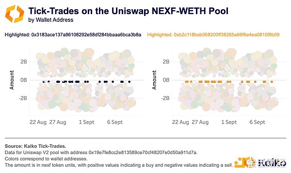 為了進(jìn)一步確認(rèn)涉及此Tokens的洗盤交易,檢查該Tokens唯一存在的二級(jí)市場(chǎng)的市場(chǎng)數(shù)據(jù)。通過(guò)匯總此Uniswap市場(chǎng)上的每日交易量并比較買入和賣出量,發(fā)現(xiàn)兩者之間存在驚人的對(duì)稱性。這種對(duì)稱性表明,做市商每天都在抵消這個(gè)市場(chǎng)上從事洗盤交易的所有錢包的總金額。