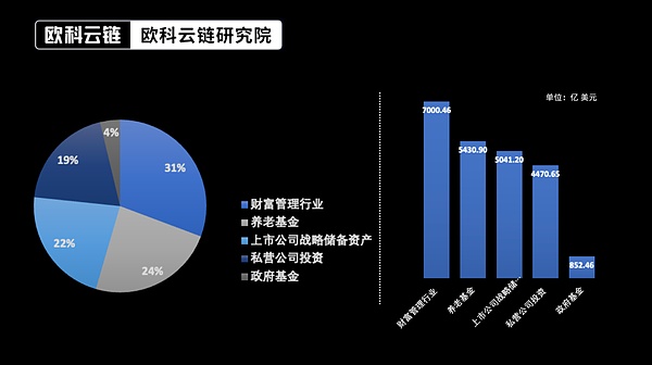 c.私營公司按照現在已披露的對公開上市公司的比重90%進行同步計算。d.財富管理行業根據摩根斯坦利、Capgemini、埃森哲等調查報告,高凈值人群中已有71%進行了對Bitcoin的投資,選取剩余待投資的高凈值人群財富規模乘以成長系數4.5%再乘以投資比例5%進行測算。