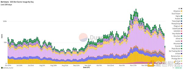 在這期間,針對Memecoin交易,工具從移動端向網頁端進行拓展,針對不同的細分需求,既有多鏈兼容的專業交易網站,比如gmgn.ai、Bullx、Photon,也有方便快捷的TGbot比如BananaGun、Tojan、Bonkbot等。這些專門針對Memecoin交易的服務工具借助Memecoin淘金熱,從全面向深度逐步過渡,關聯錢包分析、推特監控、安全檢測等工具日益完善,產品商業模式得到驗證。在這過程中,TGBot用戶數量也在不斷增加,日活用戶最高超14萬人,日均交易額最高近5億美元,雖然相對鏈上DEX還有很長一段路要走,但在Memecoin超級周期影響下,這個細分領域仍是藍海。
