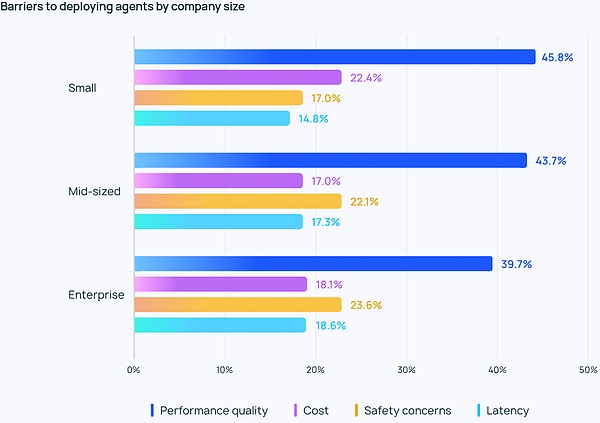 此外,78%的受訪者有在近期內將采用將Agent投入生產的計劃。很明顯,大家對AIAgent有很強烈的興趣,但實際要做好一個production-ready的Agent對許多人來說仍然是一個難題。