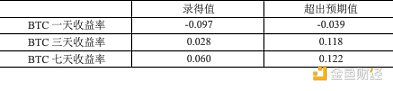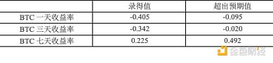 除了美聯(lián)儲每年8次的利率調(diào)整外,美國定期發(fā)布的宏觀數(shù)據(jù)也能反映當前貨幣政策下的經(jīng)濟狀況,市場通常根據(jù)這些數(shù)據(jù)預(yù)測貨幣政策改革或經(jīng)濟周期變化,從而影響幣價。重要的宏觀數(shù)據(jù)包括美國季調(diào)后非農(nóng)就業(yè)人口變動、初請失業(yè)金人數(shù)、實際國內(nèi)生產(chǎn)總值(GDP)年化季率以及核心居民消費價格指數(shù)(CPI)月率。下表列出了2024年Bitcoin幣價在這些指標發(fā)布當天、三天內(nèi)和七天內(nèi)的短期收益率與各宏觀指標的錄得值和超出預(yù)期值之間的相關(guān)性。