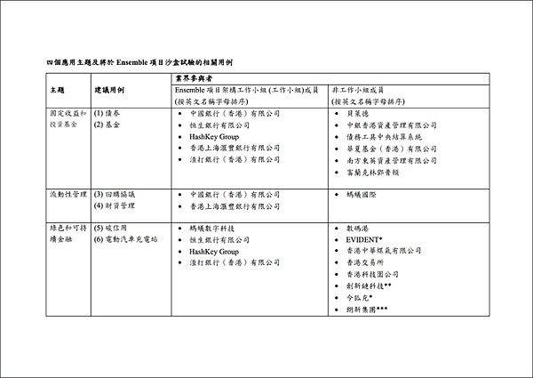 2024年8月28日,香港金管局舉行Ensemble項目沙盒啟動儀式,宣布沙盒的首階段試驗將涵蓋傳統金融資產和現實世界資產的Tokens化,并聚焦四大主題:固定收益和投資基金、流動性管理、綠色和可持續金融,及貿易和供應鏈融資。通過試驗,金管局將驗證Tokens化資產、Tokens化存款和wCBDC之間的技術互通性,亦會讓業界參與者在實際業務場景中,對Tokens化資產交易進行端對端測試。