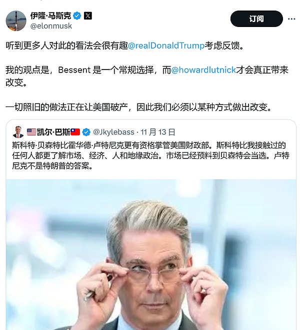 盧特尼克的提名得到了多方支持。衛(wèi)生部長(zhǎng)被提名者小羅伯特·肯尼迪(RobertF.KennedyJr.)在社交媒體上稱贊他是“Bitcoin最強(qiáng)有力的倡導(dǎo)者”,而馬斯克也公開支持盧特尼克出任財(cái)政部長(zhǎng)。