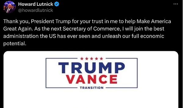 2024年11月19日,特朗普提名建達(dá)公司(CantorFitzgerald)的CEO霍華德·盧特尼克(HowardLutnick)擔(dān)任新一任商務(wù)部長(zhǎng)。