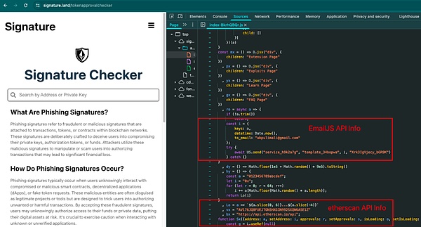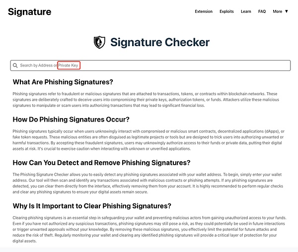 我們隨即對該工具 SignatureChecker(http://signature[.]land)進行分析,一打開便看到,該工具竟然支持用戶輸入私鑰來查詢。本來沒有風險的地址,在這個網頁輸入了私鑰,也得有風險了。