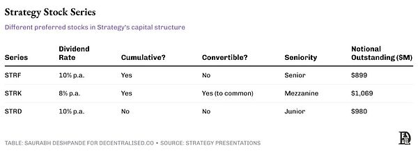 STRF:永久優(yōu)先股,10%累積股息,優(yōu)先級(jí)最高。如果Strategy未能支付股息,必須在支付其他股東之前支付所有未付的STRF股息,并且股息率會(huì)因違約而增加作為懲罰。