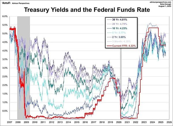 結合當前美債收益率結構,3個月期美債收益率(4.35%)高于2年期收益率(3.69%),10年期收益率(4.23%)雖高于2年期,但主要受長期通脹預期支撐——市場將美聯儲9月降息預期解讀為“對滯脹的被動應對”,而非“經濟韌性下的主動調整”,這種“短期利率下跌+長期通脹黏性”的組合,符合“惡性陡峭化”的核心特征。