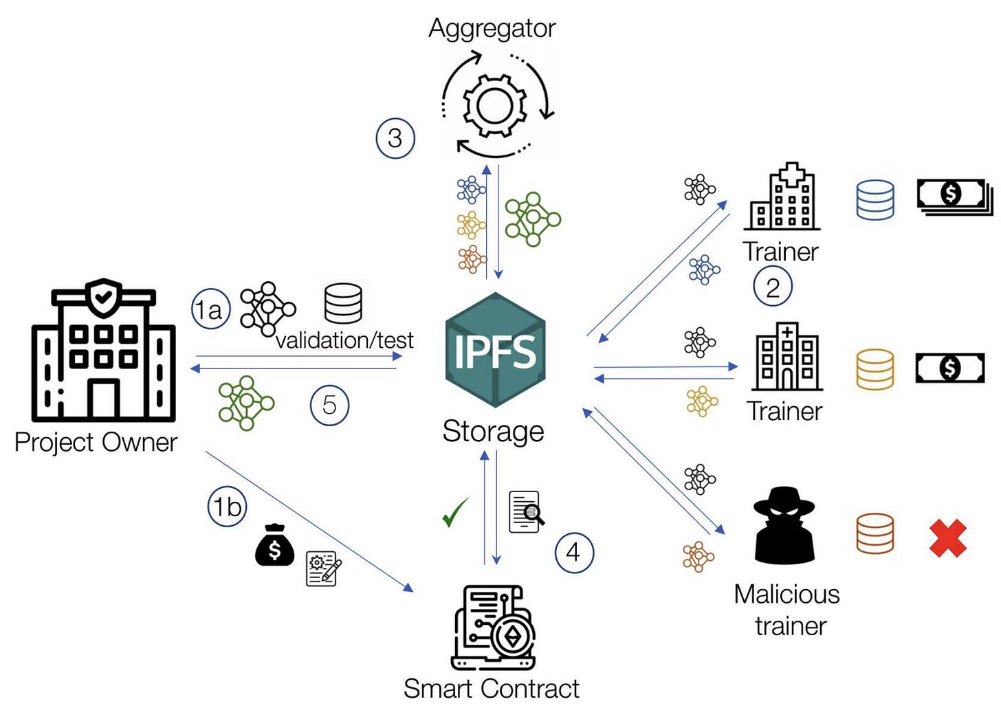 Proof-of-Intelligence(PoI)是ChainOpera在CoAI協(xié)議下提出的核心共識(shí)機(jī)制,旨在為去中心化AI構(gòu)建提供透明、公平且可驗(yàn)證的激勵(lì)與治理體系。其基于Proof-of-Contribution(貢獻(xiàn)證明) 的Blockchain協(xié)作機(jī)器學(xué)習(xí)框架,旨在解決聯(lián)邦學(xué)習(xí)(FL)在實(shí)際應(yīng)用中存在的激勵(lì)不足、隱私風(fēng)險(xiǎn)與可驗(yàn)證性缺失問(wèn)題。該設(shè)計(jì)以智能合約為核心,結(jié)合去中心化存儲(chǔ)(IPFS)、聚合節(jié)點(diǎn)和零知識(shí)證明(zkSNARKs),實(shí)現(xiàn)了五大目標(biāo):①按貢獻(xiàn)度進(jìn)行公平獎(jiǎng)勵(lì)分配,確保訓(xùn)練者基于實(shí)際模型改進(jìn)獲得激勵(lì);②保持?jǐn)?shù)據(jù)本地化存儲(chǔ),保障隱私不外泄;③引入魯棒性機(jī)制,對(duì)抗惡意訓(xùn)練者的投毒或聚合攻擊;④通過(guò)ZKP確保模型聚合、異常檢測(cè)與貢獻(xiàn)評(píng)估等關(guān)鍵計(jì)算的可驗(yàn)證性;⑤在效率與通用性上適用于異構(gòu)數(shù)據(jù)和不同學(xué)習(xí)任務(wù)。
