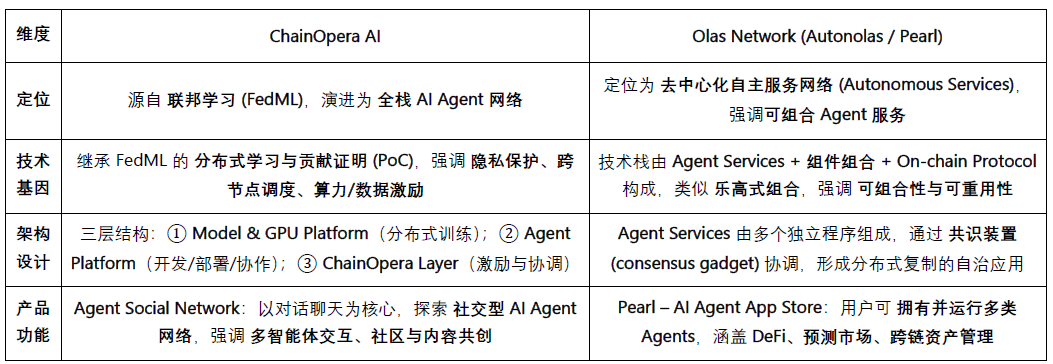 如果說(shuō) FedML 是技術(shù)內(nèi)核,提供了聯(lián)邦學(xué)習(xí)與分布式訓(xùn)練的開源基因;TensorOpera 將FedML的科研成果抽象為可商用的全棧AI基礎(chǔ)設(shè)施,那么 ChainOpera 則是將TensorOpera的平臺(tái)能力“上鏈”,通過(guò) AITerminal+AgentSocialNetwork+DePIN模型與算力層+AI-NativeBlockchain 打造一個(gè)去中心化的Agent網(wǎng)絡(luò)生態(tài)。其核心轉(zhuǎn)變?cè)谟冢琓ensorOpera仍主要面向企業(yè)與開發(fā)者,而ChainOpera借助Web3化的治理與激勵(lì)機(jī)制,把用戶、開發(fā)者、GPU/數(shù)據(jù)提供者納入共建共治,讓AIAgent不只是“被使用”,而是“被共創(chuàng)與共同擁有”。