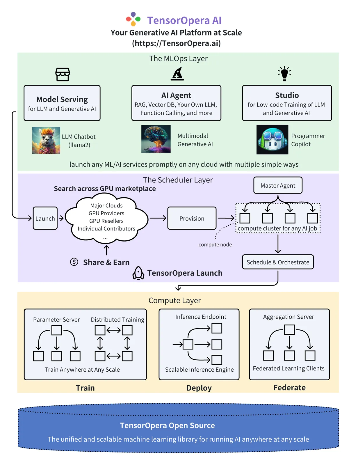 中樞平臺(tái)與技術(shù)基座:TensorOperaGenAI&FedMLTensorOpera提供覆蓋MLOps、Scheduler、Compute的全棧GenAI平臺(tái);其子平臺(tái)FedML從學(xué)術(shù)開源成長(zhǎng)為產(chǎn)業(yè)化框架,強(qiáng)化了AI“隨處運(yùn)行、任意擴(kuò)展”的能力。
