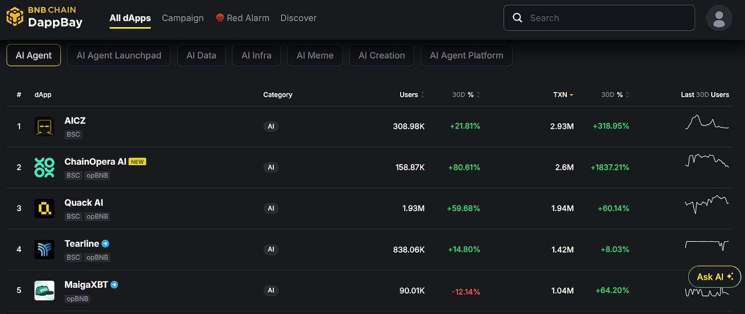 在 應(yīng)用與用戶規(guī)模 上,AITerminal已形成數(shù)十萬(wàn)日活用戶與千級(jí)Agent應(yīng)用生態(tài),并在BNBChainDAppBayAI類目排名第一,具備明確的鏈上用戶增長(zhǎng)與真實(shí)交易量。其多模態(tài)場(chǎng)景覆蓋的加密原生領(lǐng)域有望逐步外溢至更廣泛的Web2用戶。