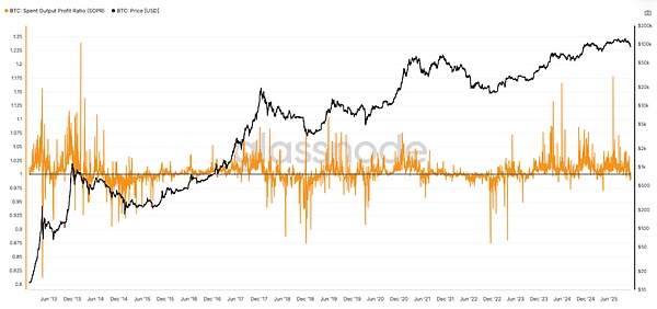MVRV是市場(chǎng)價(jià)值與實(shí)際價(jià)值之比,當(dāng)MVRV值升高時(shí),意味著B(niǎo)itcoin處于估值過(guò)高狀態(tài)。2023年底MVRV跌至0.8,2024行情好時(shí)曾升至2.8,2025年初回調(diào)中,MVRV回落至2以下,估值沒(méi)有高估,也未達(dá)到低估水平,整體周期漲跌節(jié)奏仍在。