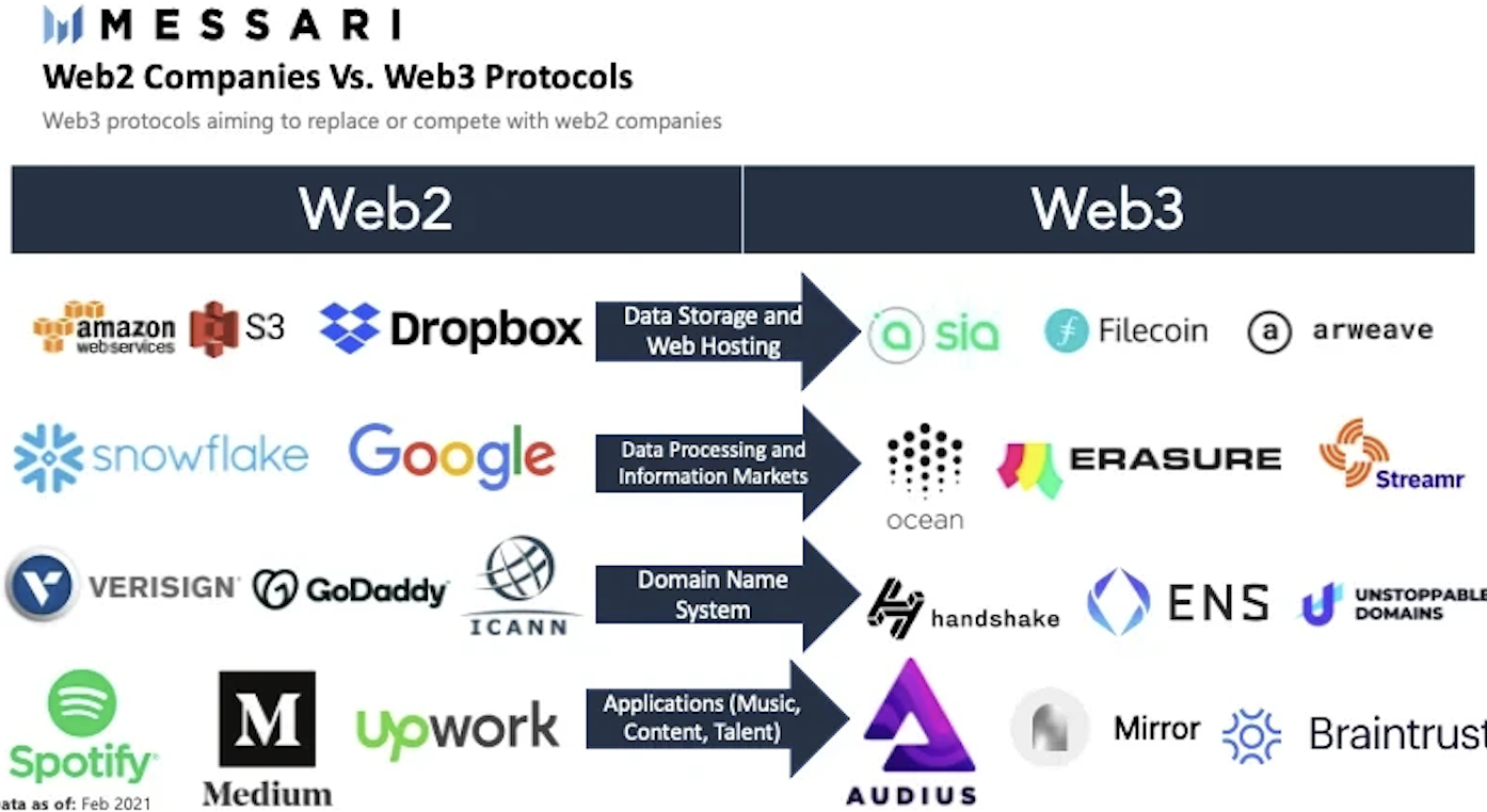 在Web3.0中,有Sia、Filecoin、Arweave等分布式存儲協議,有Ocean protocol、Streamr、Erasure等數據處理協議,比較成熟的ENS、TNS、Handshake等域名系統,支付工具有Metamask,內容分發平臺有Mirror等,Decentralization社交工具有TG與Discord等等,可以認為Web3.0協議已經初具形態。