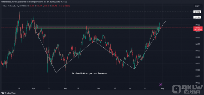 SOL的價格走勢顯示出強勁的看漲勢頭,社區預計將重新測試210美元的年度高點。截至撰寫本文時,SOL已突破看漲雙底形態,目前上方阻力位為202美元。盡管該阻力相對較弱,重新測試年度高點的可能性很大,但SOL目前正在調整,跌破190美元大關。
