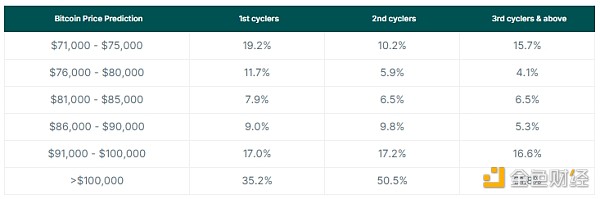 crypto新手對Bitcoin的期望較低,30.9% 的人預測本輪最高價格為 80,000 美元,而只有 16.1% 的第二輪參與者和 19.8% 的老手有同樣的預測。
