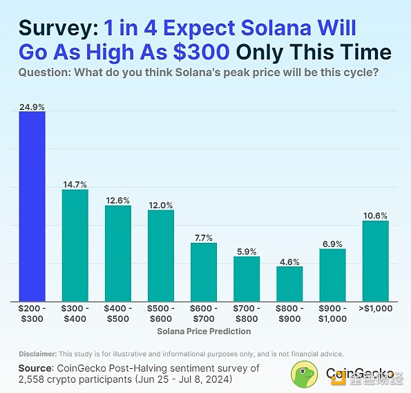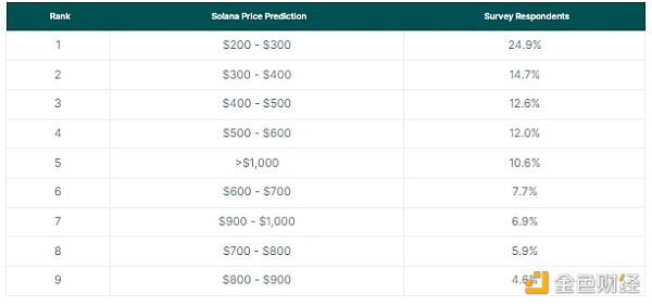 與Bitcoin相比,crypto參與者對 Solana 的潛在價格上漲持較為保守的看法。調查發現,24.9% 的crypto參與者預計 Solana 本周期的價格只會升至 300 美元,這成為Ethereum競爭對手最受歡迎的預測。換句話說,這些參與者并不認為 Solana 的價格會大幅高于上一輪牛市創下的歷史最高價。
