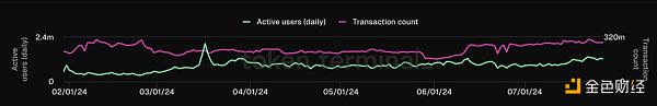 例如,7 月 26 日星期五,ETH 的交易筆數為 110 萬,而 DAU 為 376.3 萬,平均每位用戶每天的交易量約為 2.92 筆。然而,SOL 的交易筆數為 2.822 億,而 DAU 為 130 萬,平均每位用戶每天的交易量高達 217 筆。