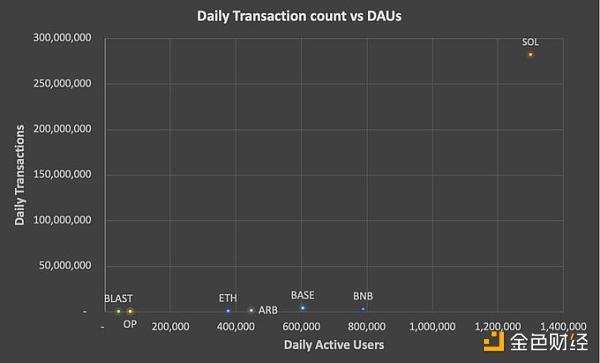 從表面上看,Solona的數字看起來不錯,每日活躍用戶 (DAU) 超過 130 萬,而 ETH 則為 376,300。然而,當我們將交易筆數添加到組合中時,我注意到有些奇怪。