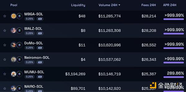 每一個低流動性池都是在過去 24 小時內跑路的項目。以 MBGA 為例,在過去 24 小時內,Raydium 上發生了 46,000 筆交易,交易量達 1,080 萬美元,2,845 個獨立錢包進行買賣,并產生了超過 28,000 美元的費用。(請注意,類似規模得到廣泛認可的LP,MEW,僅生成了 11.2K 筆交易)