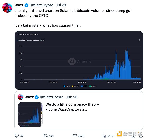 穩定幣交易量動態凸顯了這一點,@WazzCrypto注意到 CFTC 宣布調查 Jump 后穩定幣交易量突然下降: