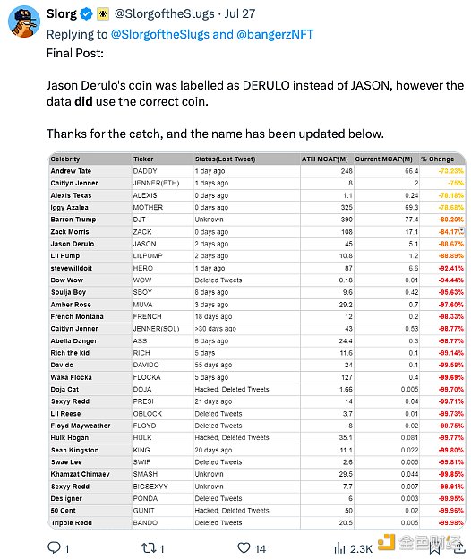 除了跑路和 MEV,散戶的前景仍然暗淡。名人們選擇 Solana 作為他們的首選公鏈,但結果并不樂觀: