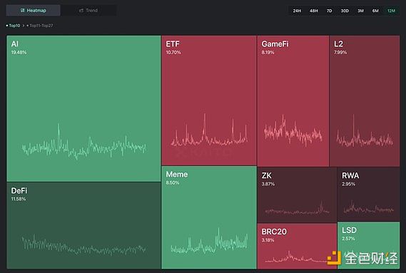 在過去的兩年里,人工智能顯然已經成為科技界的焦點,吸引了企業家、投資者和用戶的關注。當然,這種熱情也蔓延到了加密領域。根據Kaito Ai的數據,在過去的12個月里,AI在所有加密領域里占據了最大的敘事份額。