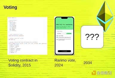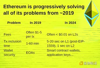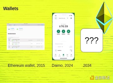 錢包方面,以錢包UI為例,Ethereum2015年的錢包界面與Bitcoin高度同質(zhì)化, 2024年錢包則更偏向傳統(tǒng)應(yīng)用的使用體驗(yàn)。Vitalik認(rèn)為二者都不是未來(lái)錢包的范式,因?yàn)镋thereum致力于創(chuàng)造一種新型的基于鏈上的社會(huì)制度。