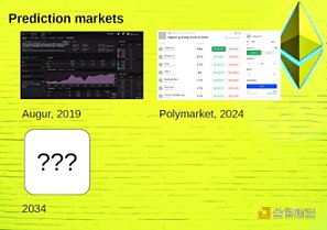 Vitalik表示,過(guò)去10年內(nèi)Blockchain的相關(guān)用例變化不大,集中于穩(wěn)定幣、金融衍生品、Decentralization交易所和預(yù)測(cè)市場(chǎng)等,所以需要討論未來(lái)用例。他在2014年談到了Decentralization交易所和預(yù)測(cè)市場(chǎng)(現(xiàn)在熱門預(yù)測(cè)市場(chǎng)Polymarket上成本相較之前降低了很多),不過(guò)沒有預(yù)測(cè)到NFT的火熱。